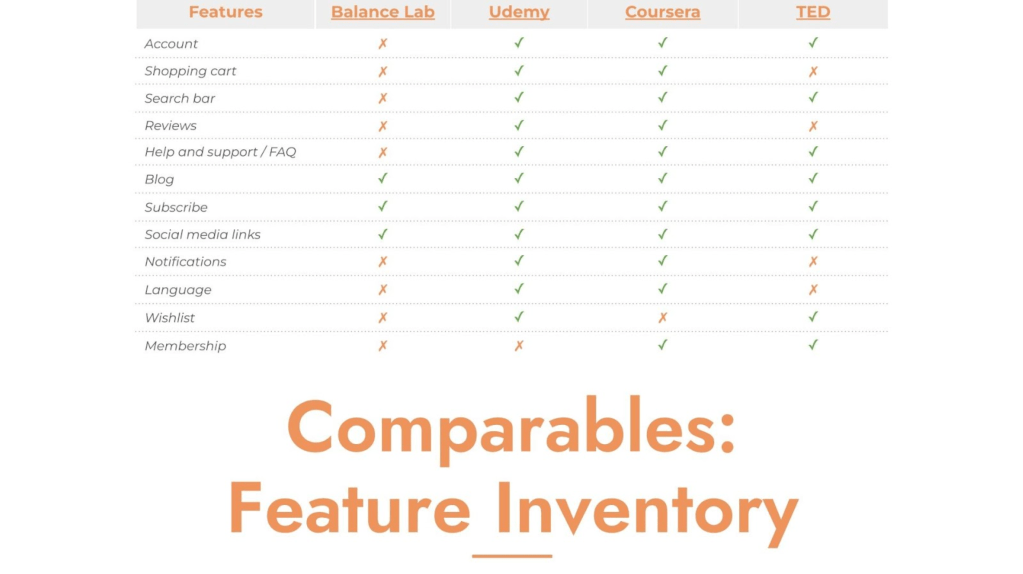 We examined websites that offer educational online programs, as this is a similar business service to Balance Lab. (Udemy and Coursera are EdTech companies.) We looked at features aiding navigation, and those that aid content understanding.