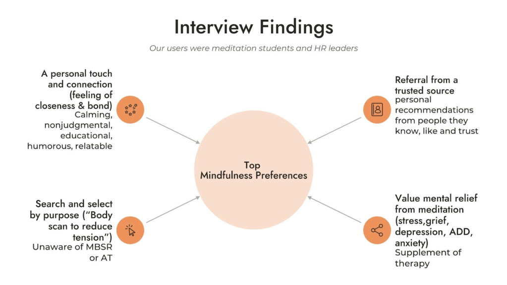 To fully understand the needs, desires and preferences of people who meditate, we spoke with Balance Lab students about their experiences, and with people who use apps or other online tools to guide their mindful meditations. Based on our interviews, we developed our top takeaways from people’s preferences, which kept our design decisions grounded in our research insights.