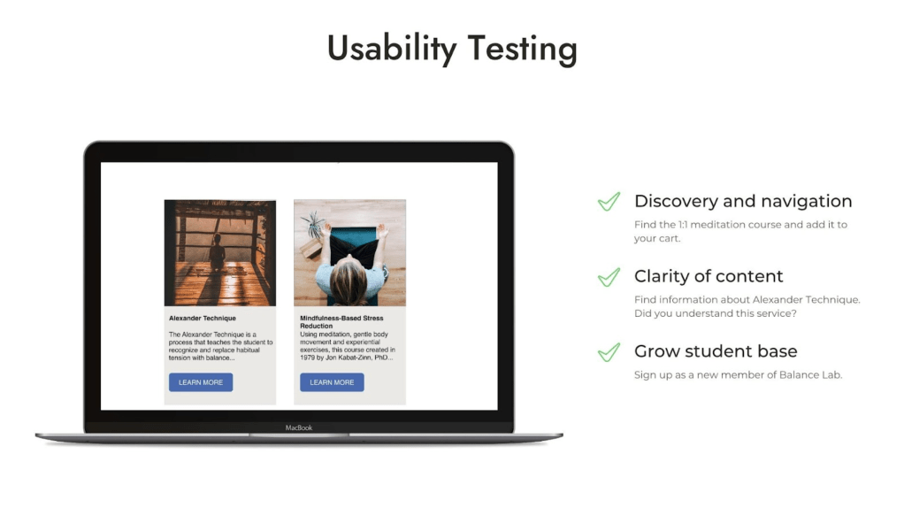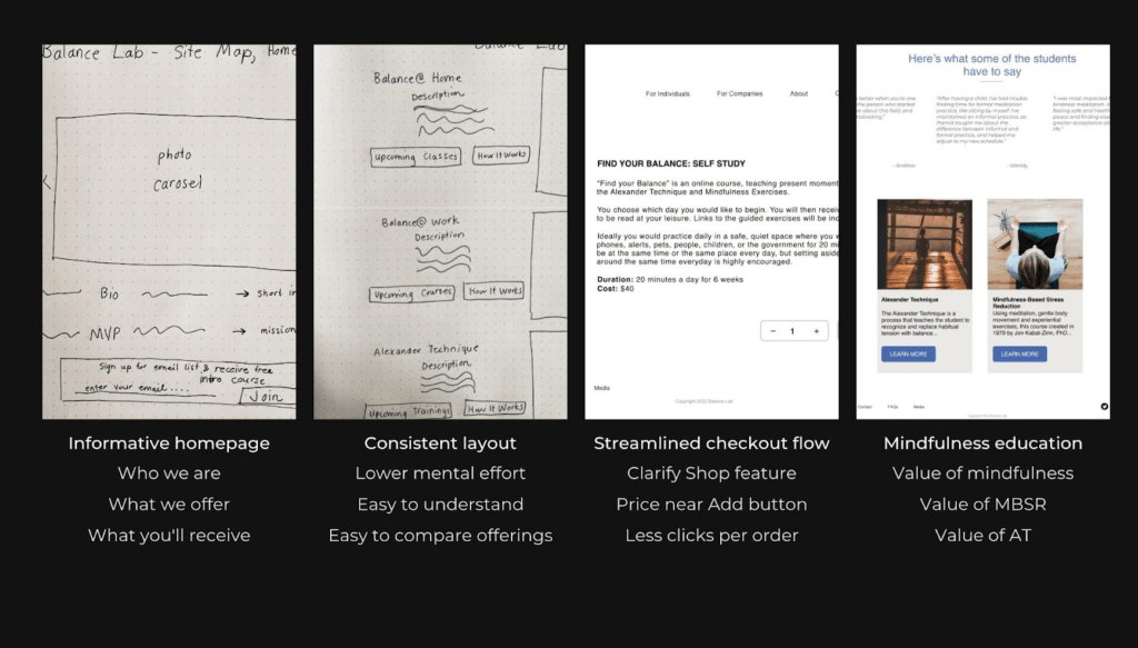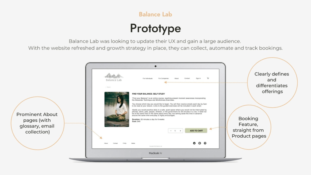 Balance Lab has created a wonderful set of mindfulness techniques, with glowing student testimonials and a warm, calming meditation teacher. Their website didn’t clearly outline what these meditation practices were, so potential students lacked clarity about their unique value.